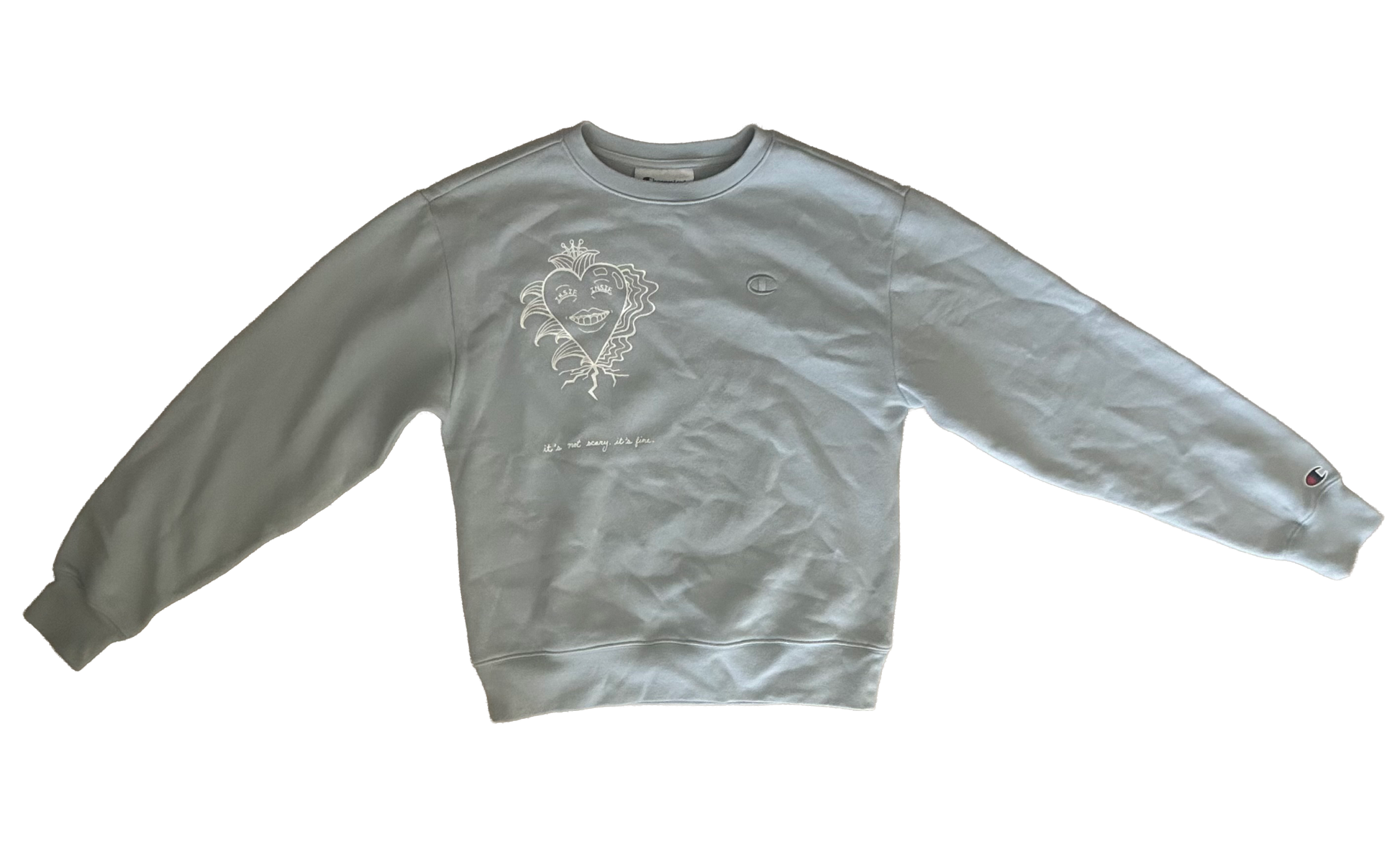 crewneck sweatshirt made of 100% cotton, light blue pastel color, features INSIF heart design and the words "it's not scary. it's fine." on the right rib area.